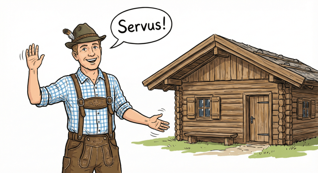 💡 Qué significa: Hola / Adiós. El equivalente sureño de «Moin», pero más versátil porque sirve para saludar al llegar y para despedirse al irse. Originalmente viene del latín «siervo» (a su servicio), pero hoy es simplemente un saludo amistoso.