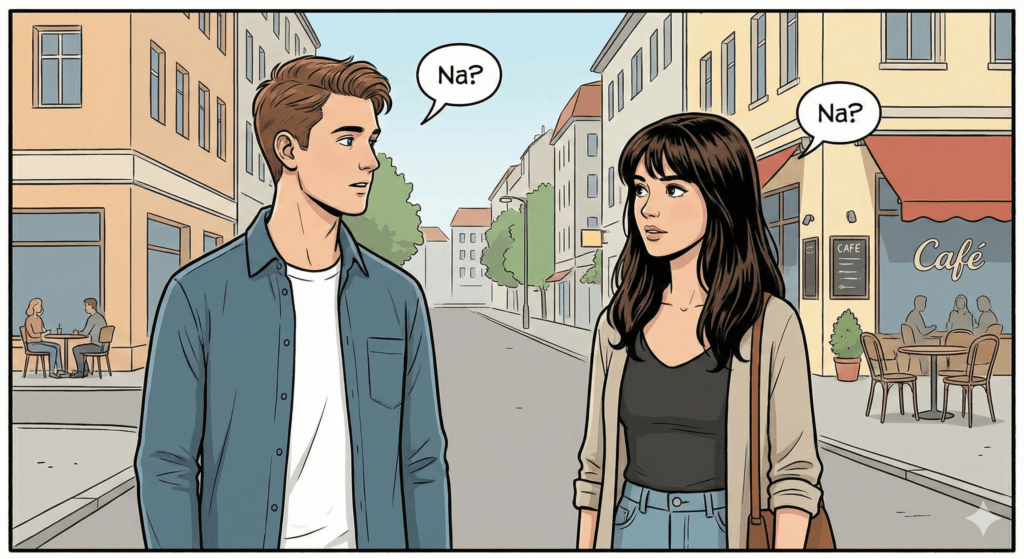 Es la conversación más eficiente del mundo. Persona A: «Na?» (¿Hola, cómo estás?) Persona B: «Na?» (Bien, ¿y tú?) ¡Y listo! Ya han hablado.