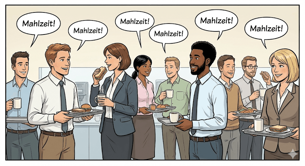 Entre las 11:30 y las 14:00, este es el único saludo aceptable en las oficinas y obras de construcción. No importa si estás comiendo o no. Si te cruzas a alguien en el pasillo a esa hora: «Mahlzeit».