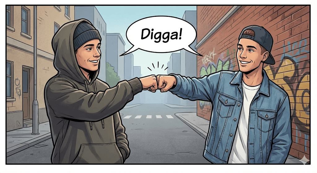 Viene de «Dicker» (gordo/amigo cercano). Se usa al final de casi cualquier frase entre amigos para enfatizar camaradería. «Alles klar, Digga?» (¿Todo bien, bro?).